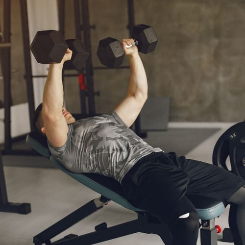 - Exercice biceps triceps haltère en superset (curl incliné + extension au-dessus de la tête) : 3 x 10 à 12 répétitions