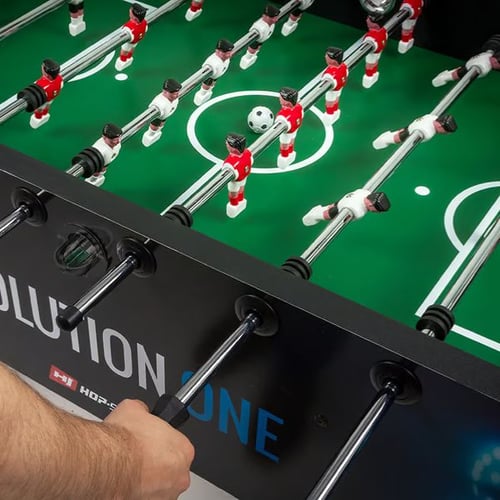Le Baby-foot Evolution One adopte une approche différente, plus graphique et expressive. Son motif de joueur de football intégré à la caisse attire immédiatement le regard. Il donne un ton résolument ludique à la pièce qui l’accueille, presque comme une affiche de match en trois dimensions.