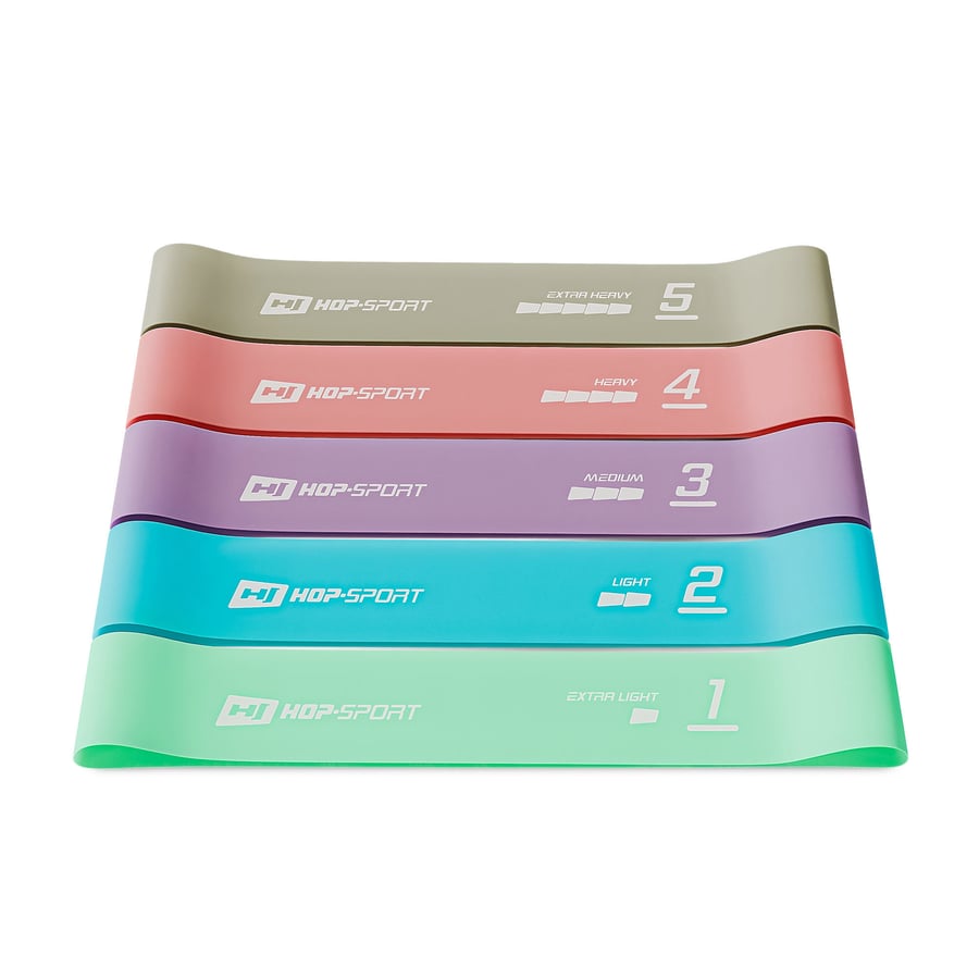 Le set contient cinq bandes distinctes. Grâce aux différents niveaux de résistance disponibles, vos muscles devront travailler avec des intensités variées pendant l'entraînement.