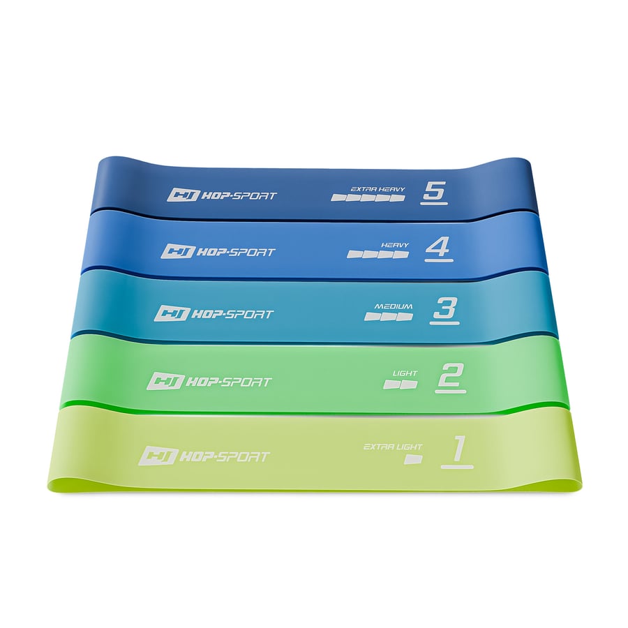 Le set contient cinq bandes distinctes. Grâce aux différents niveaux de résistance disponibles, vos muscles devront travailler avec des intensités variées pendant l'entraînement.