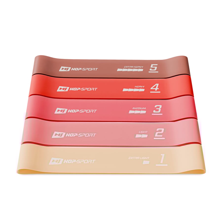 Le set contient cinq bandes distinctes. Grâce aux différents niveaux de résistance disponibles, vos muscles devront travailler avec des intensités variées pendant l'entraînement.
