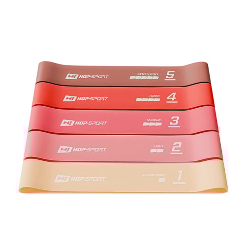 Chacune des cinq bandes de fitness HS-L650RLL génère une plage de résistance différente (du plus clair au plus foncé):