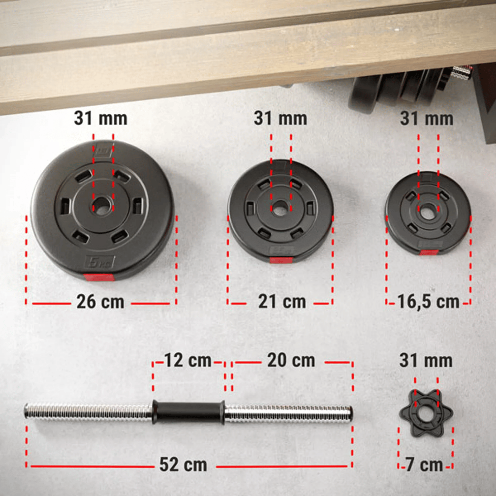 Haltères 2x20 kg avec disques de poids en plastique en 3 variantes de poids et 2 barres 52 cm Ø 30 mm avec une surface moletée en croix comprenant 4 fermetures en étoile.