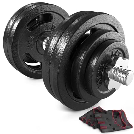 Haltère 1x30 kg avec disques en fonte en 3 variantes de poids et barre de 40 cm de long, diamètre 30 mm, incluant 2 fermetures en étoile en métal et gants en néoprène.