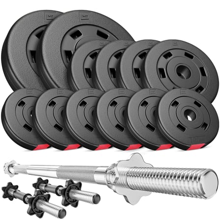 Ensemble d’haltères en plastique 38 kg (2 x 5 kg, 4 x 2,5 kg, 6 x 1,25 kg) avec barres de musculation Ø 30 mm: 2 x barres d'haltères 45 cm et 1 x barre d'haltères 167 cm incluant 6 fermetures étoile.