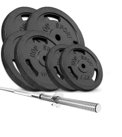 Le set d’haltères de 69 kg se compose de: 1 barre longue 167 cm, 2 fermetures étoile, poids en fonte dans la configuration suivante: 2x15 kg, 2x10 kg, 2x5 kg.