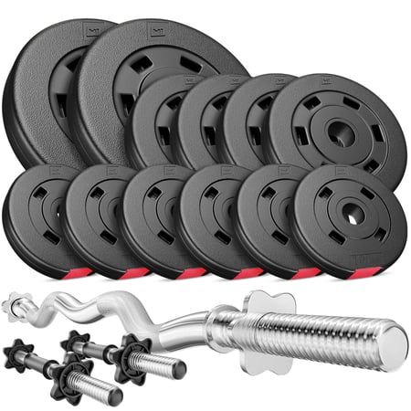 Ensemble d’haltères en plastique 36 kg (2x5 kg, 4x2,5 kg, 6x1,25 kg) avec barres Ø 30 mm: 2 barres courtes 45 cm et 1 barre Curl EZ 120 cm, incluant 6 fermetures en étoile.