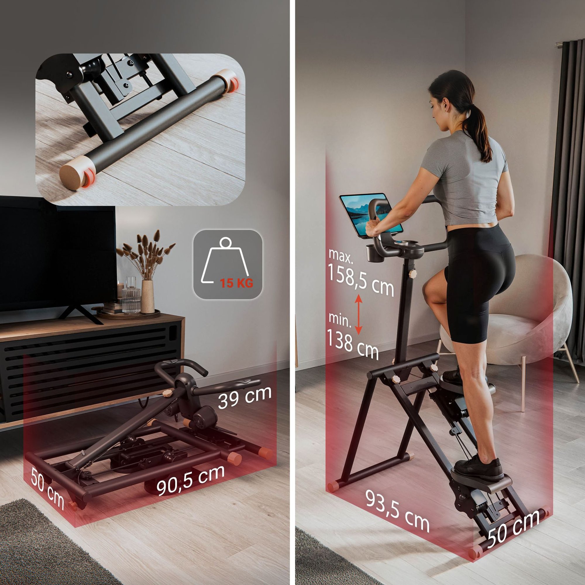 Il est idéal pour un entraînement à domicile. Après votre séance, vous pouvez le plier et le ranger facilement, car il ne prend que très peu de place. Les roulettes de transport facilitent son déplacement. Avec une capacité de charge maximale de 120 kg et une conception robuste, il combine confort, fonctionnalité et fiabilité - parfait pour tout intérieur.