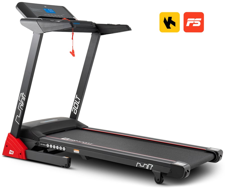 Tapis de course inclinable HS-1400LB Bolt avec Bluetooth et applications Fitshow et Kinomap, ordinateur avec 12 programmes d'entraînement et de mesure. Tapis roulant atteignant une vitesse maximale de 14 km/h.
