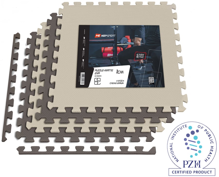 Tapis puzzle de Hop-Sport, mousse EVA 1 cm – 4 pièces, tapis de sol pour salle de sport et appareils de fitness, résistant à l'eau, produit certifié, Marron-Beige.