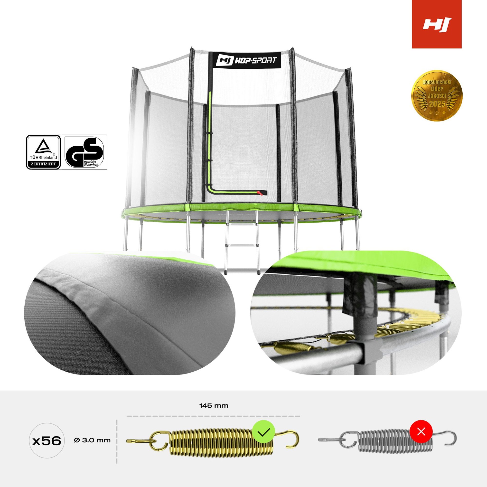 Le trampoline Hop-Sport HS-T10A (305 cm) se distingue par sa sécurité certifiée TÜV, sa structure en acier robuste, son tapis de saut élastique et son filet extérieur offrant une liberté de saut maximale.