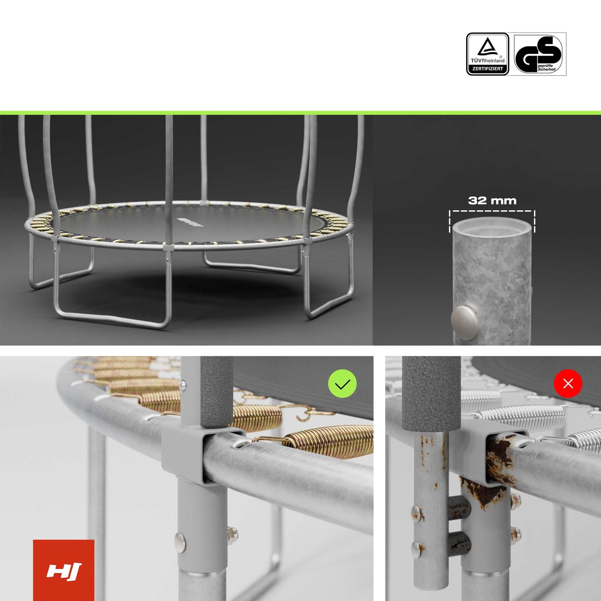 Le trampoline HS-PT08I est conçu pour une longue durée de vie et une stabilité maximale. Son cadre en acier galvanisé est résistant à la corrosion et donc adapté à diverses conditions météorologiques. Les connexions innovantes en forme de T permettent un assemblage rapide et facile, tandis que quatre pieds solides à section épaisse assurent une stabilité maximale lors du saut. Avec les certificats TÜV/GS, la plus haute qualité et sécurité du produit sont confirmées.