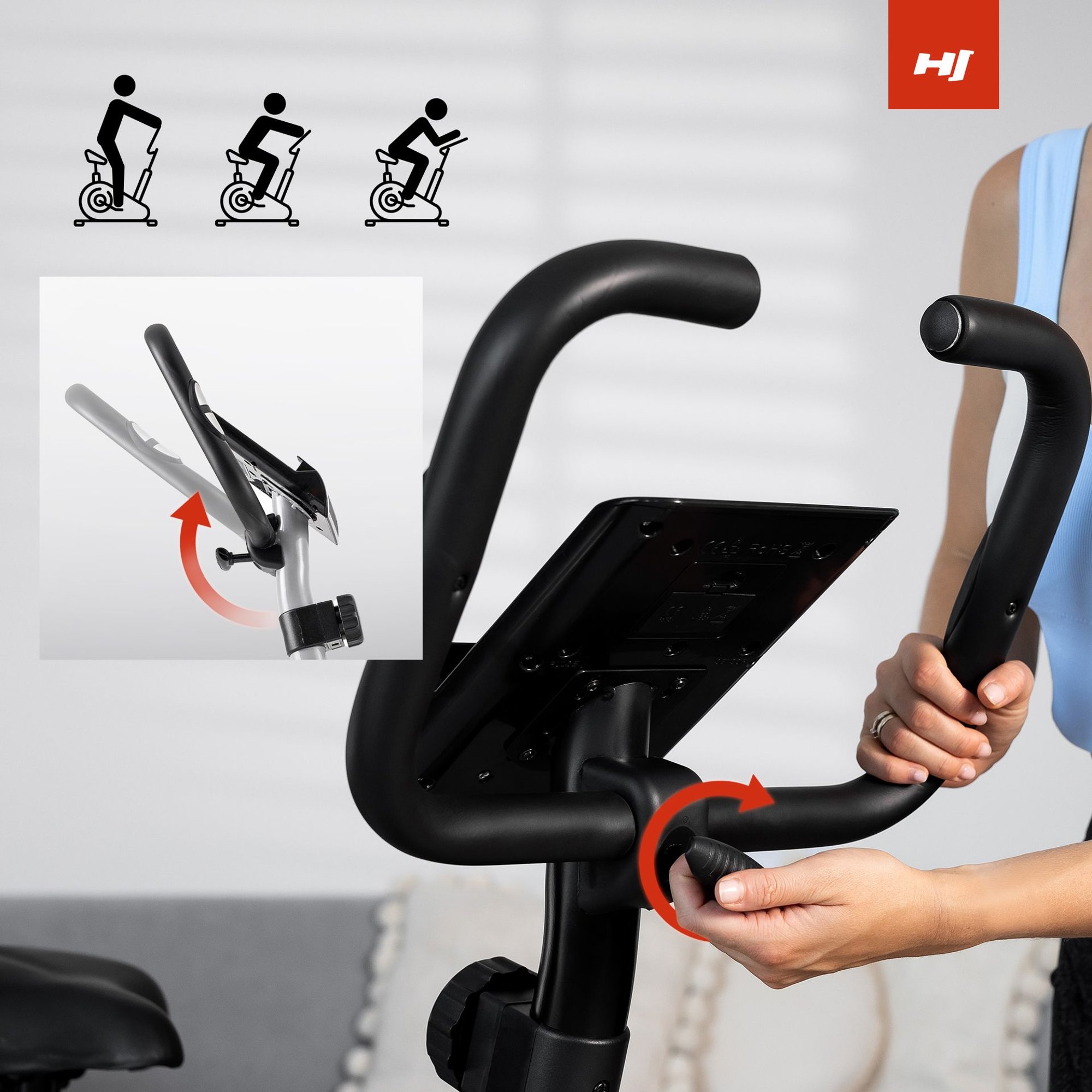Avec le HS-2050H Sonic, la hauteur de la tige de selle peut être réglée dans une plage de 65 à 80 cm. Il y a un bouton rotatif au-dessus du guidon. Pour ajuster la hauteur à vos besoins, dévissez le bouton, réglez la hauteur souhaitée et revissez-le dans l'un des trous pré-percés. L'inclinaison verticale de la selle elle-même peut également être ajustée à l'aide de la vis à écrou, située directement sous la selle.