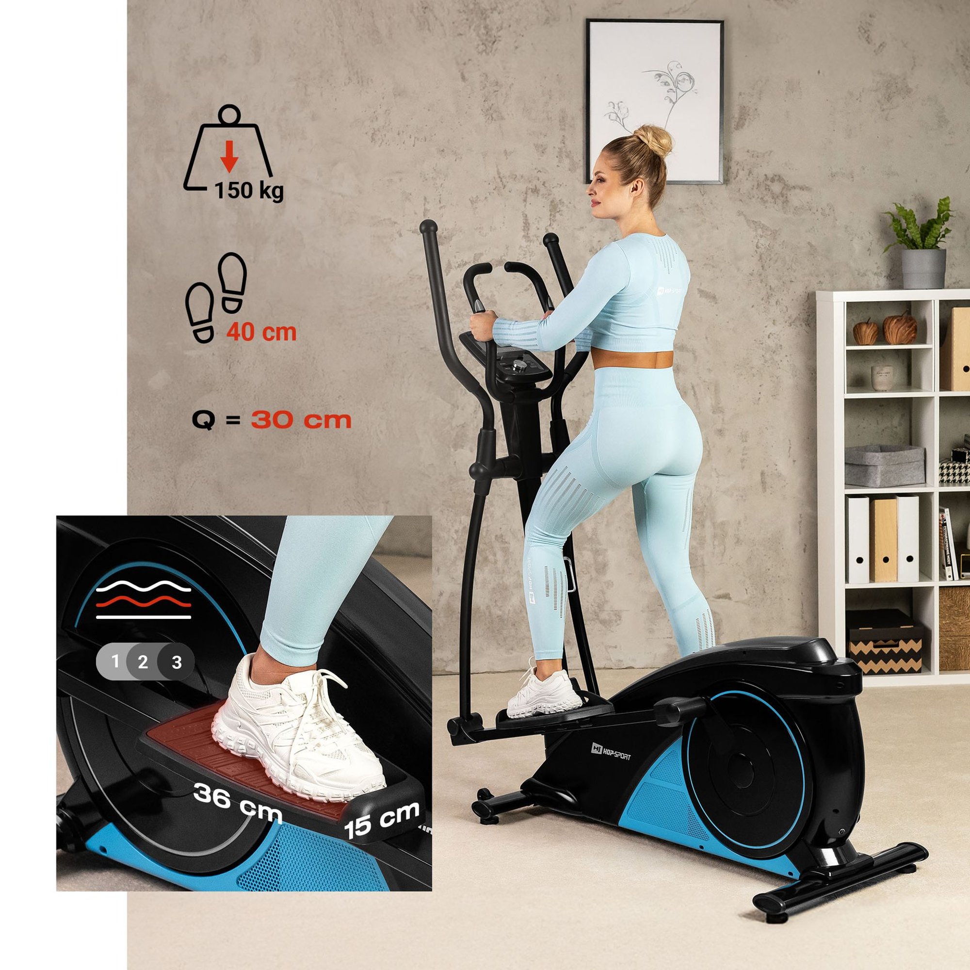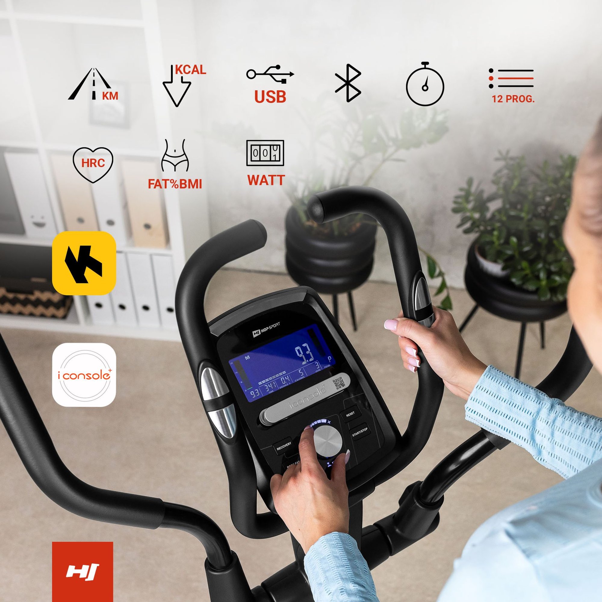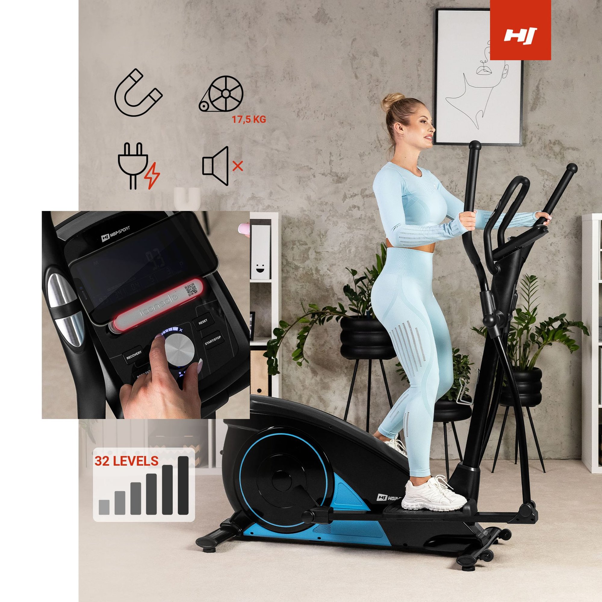Le vélo elliptique électrique Hop-Sport 060C Blaze, ordinateur avec programmes d'entraînement, USB et Bluetooth. Poids du système de résistance magnétique 17,5 kg avec régulation électronique.
