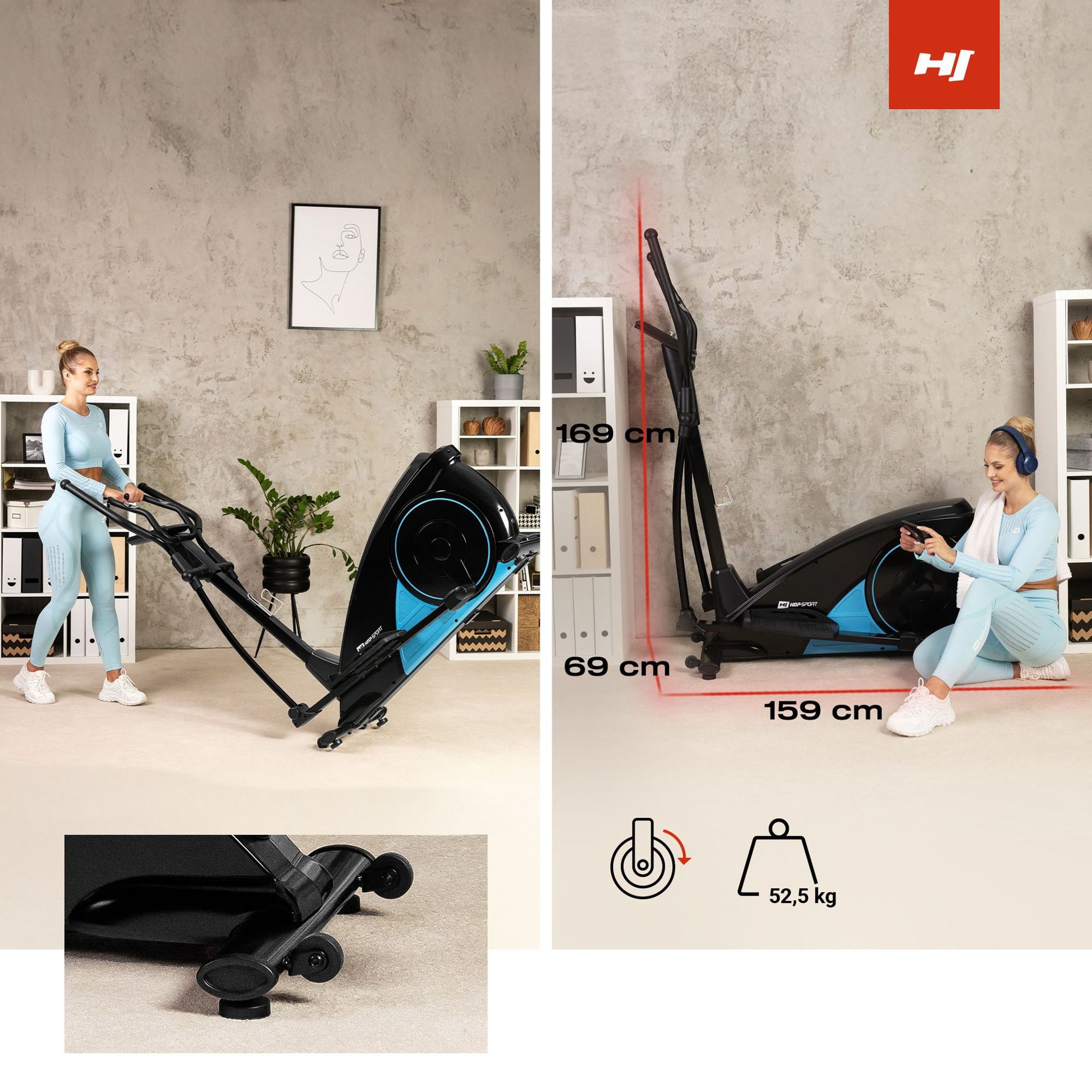 Après l'entraînement, vous n'aurez pas à vous soucier de l'apparence de votre salon. Grâce aux roulettes de transport intégrées, vous pouvez facilement déplacer l'appareil d'un endroit à l'autre. Les pieds de stabilisation spéciaux permettent un nivellement et un placement corrects.