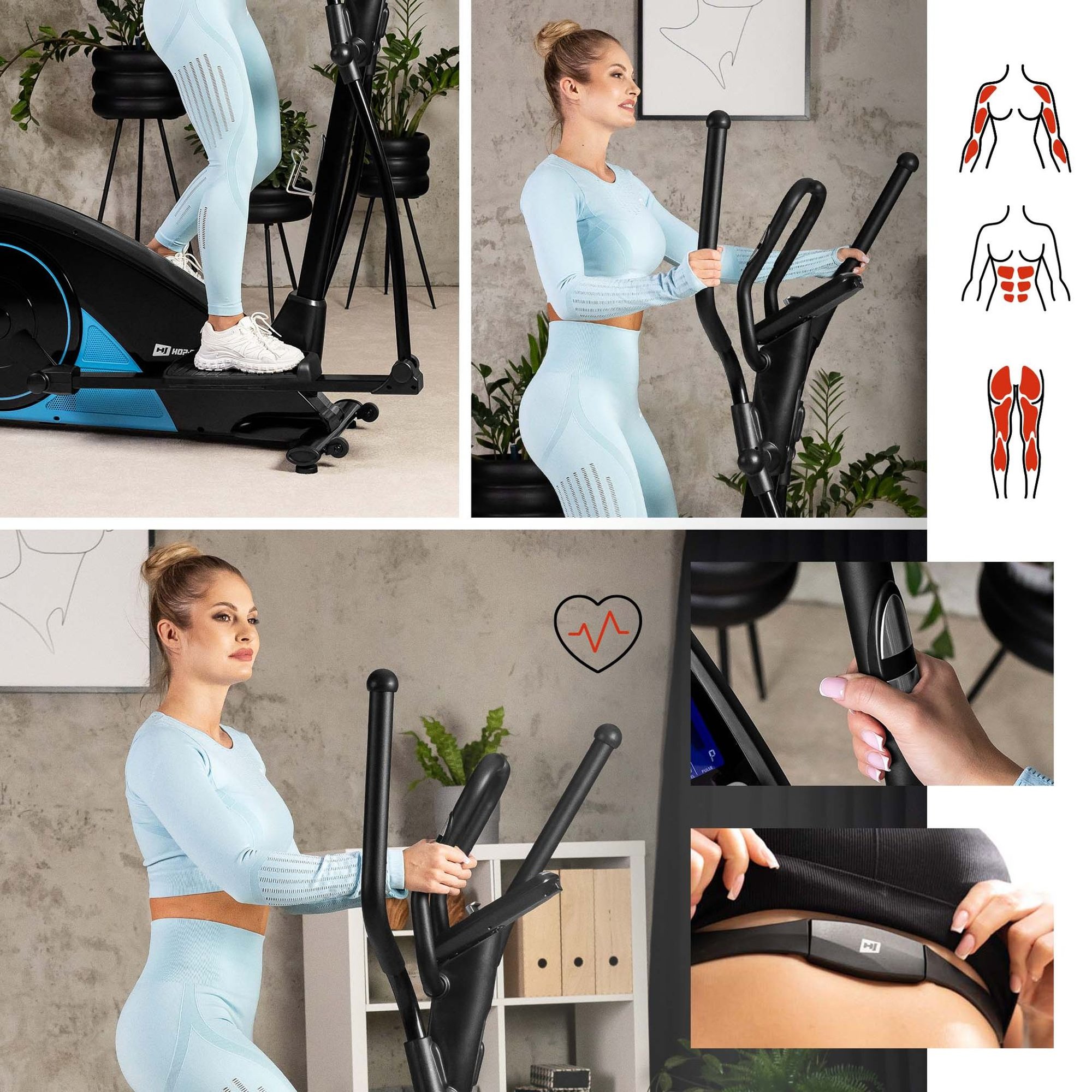 Le vélo elliptique Blaze est compatible avec la ceinture pectorale HS-095PR de Hop-Sport. Vous pouvez acheter la ceinture cardiaque chez nous! Avec une ceinture pectorale, vous mesurez votre pouls sans interrompre l'entraînement. La valeur actuelle du pouls est affichée sur l'écran.