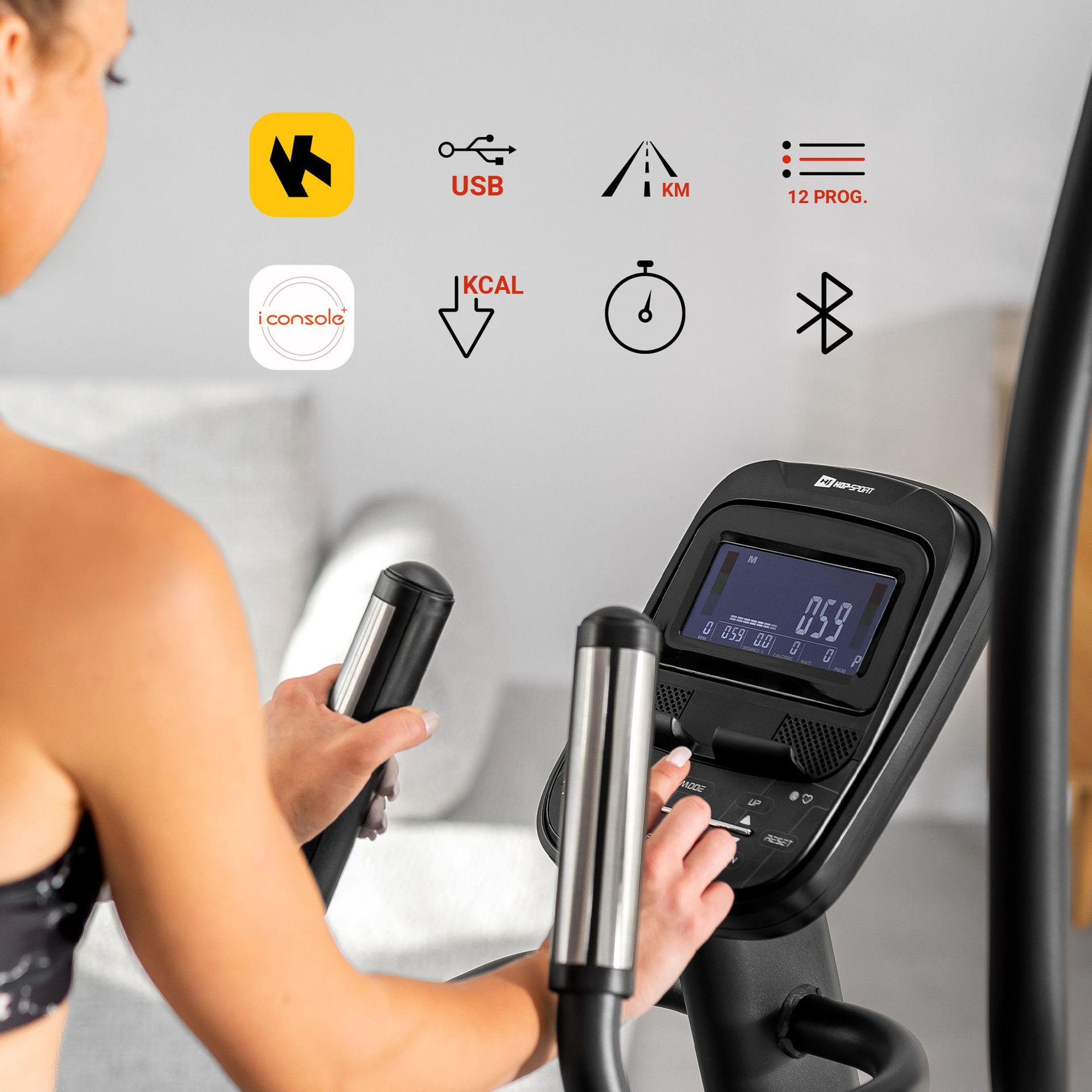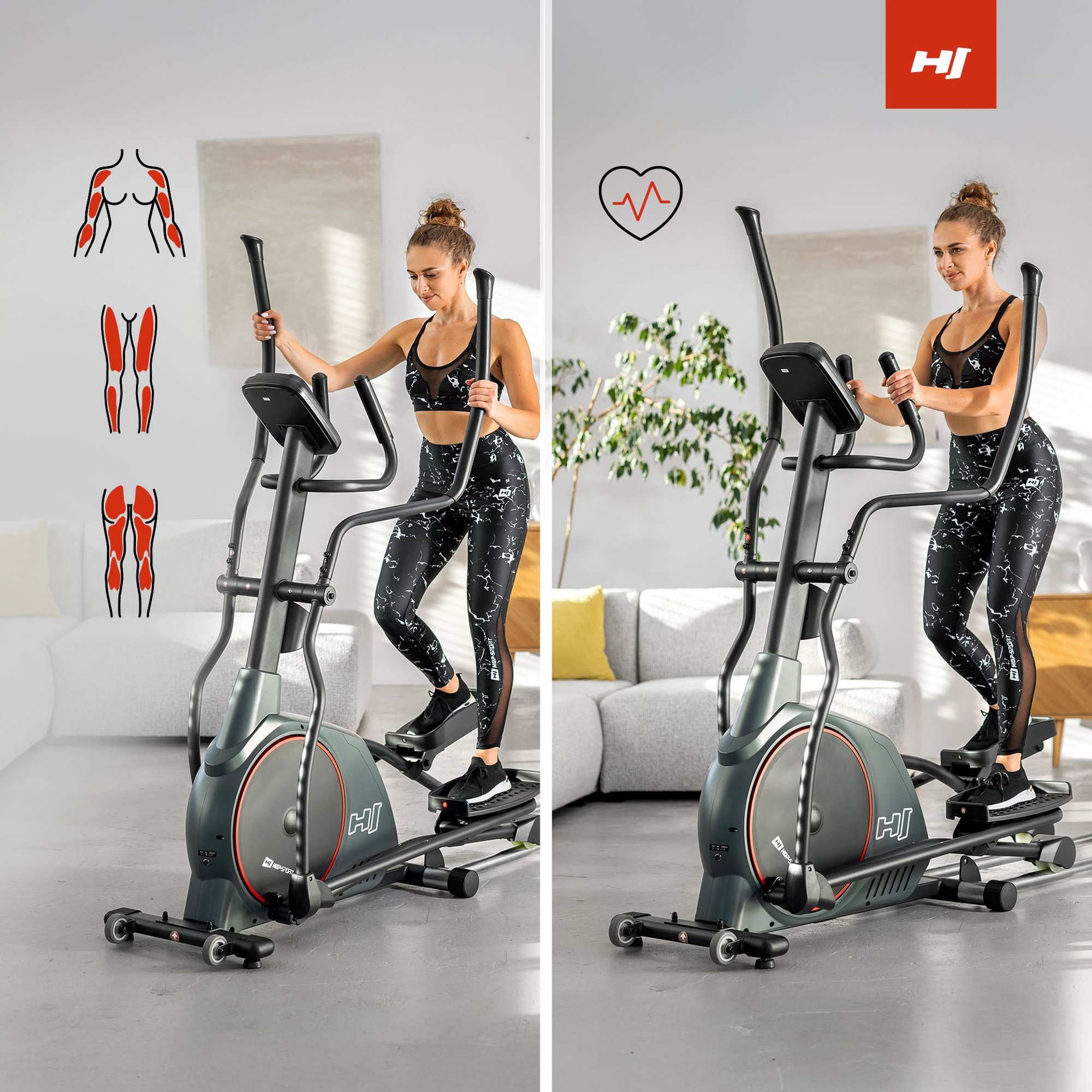La fréquence cardiaque est mesurée par des pulsomètres situés sur des poignées. En outre, le vélo elliptique est compatible avec la ceinture cardiaque HS-P095PR de Hop-Sport (5,3 kHz), ce qui vous permet de surveiller confortablement votre pouls sans avoir à garder les mains sur les capteurs de pouls.