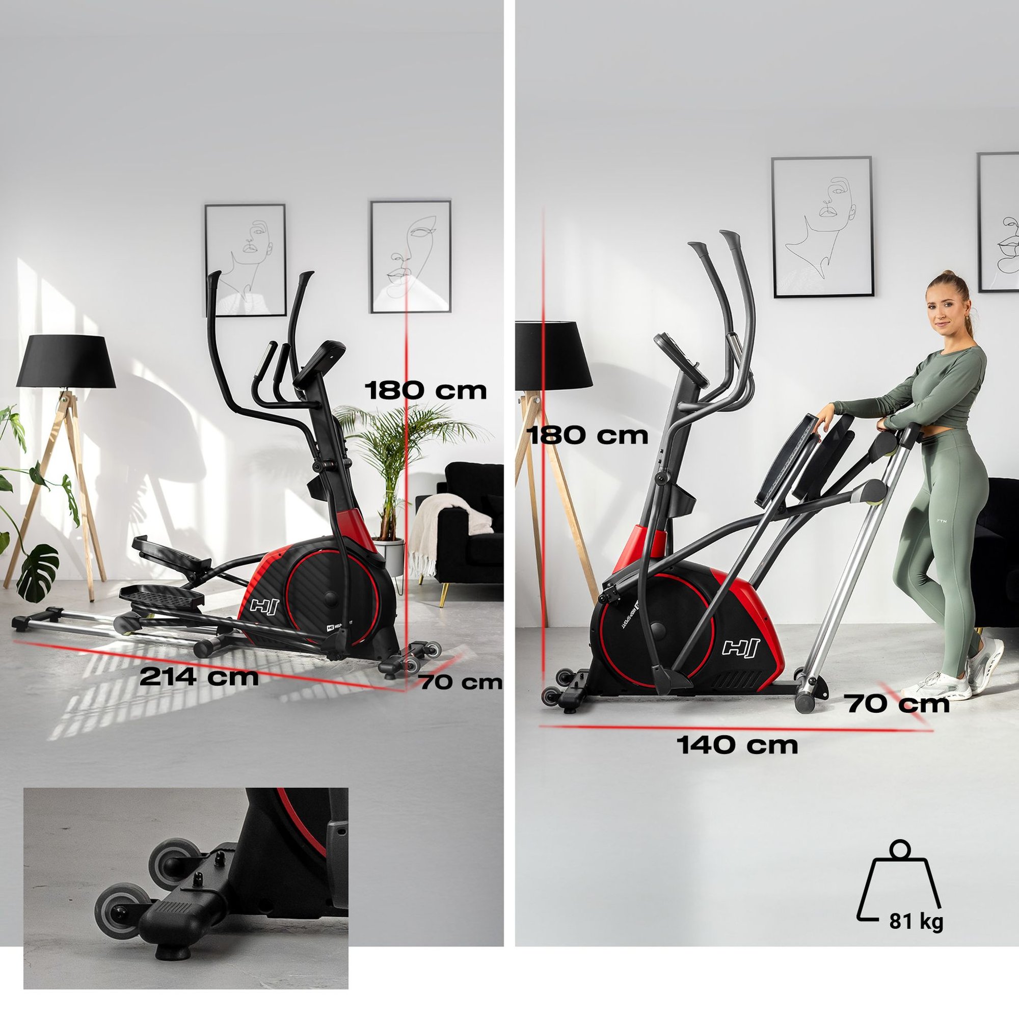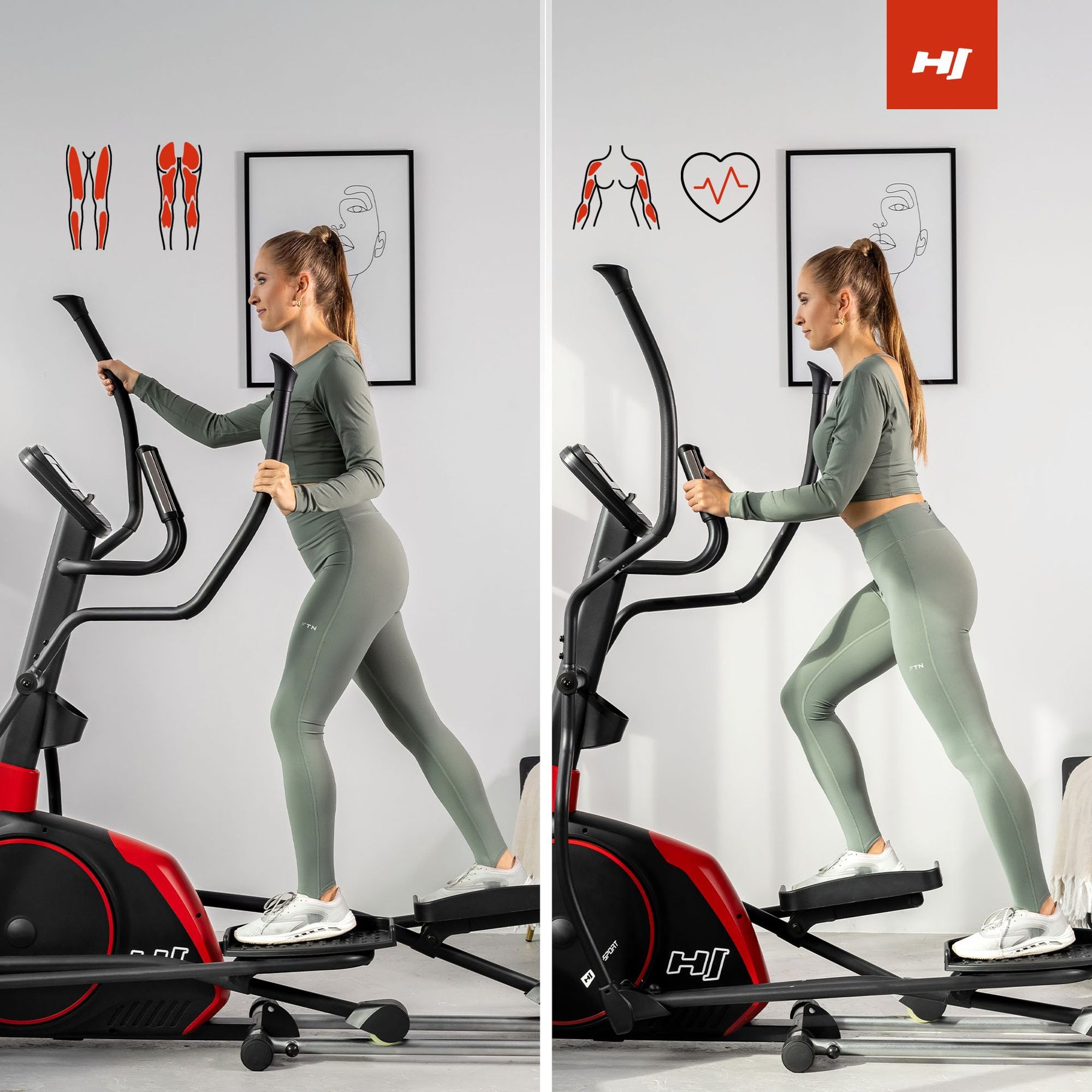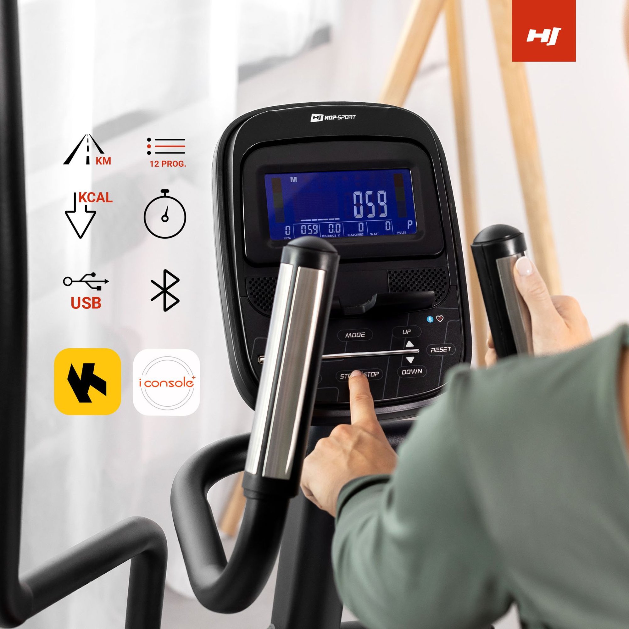 La fréquence cardiaque est mesurée par des pulsomètres situés sur des poignées. En outre, le vélo elliptique est compatible avec la ceinture cardiaque HS-P095PR de Hop-Sport (5,3 kHz), ce qui vous permet de surveiller confortablement votre pouls sans avoir à garder les mains sur les capteurs de pouls.